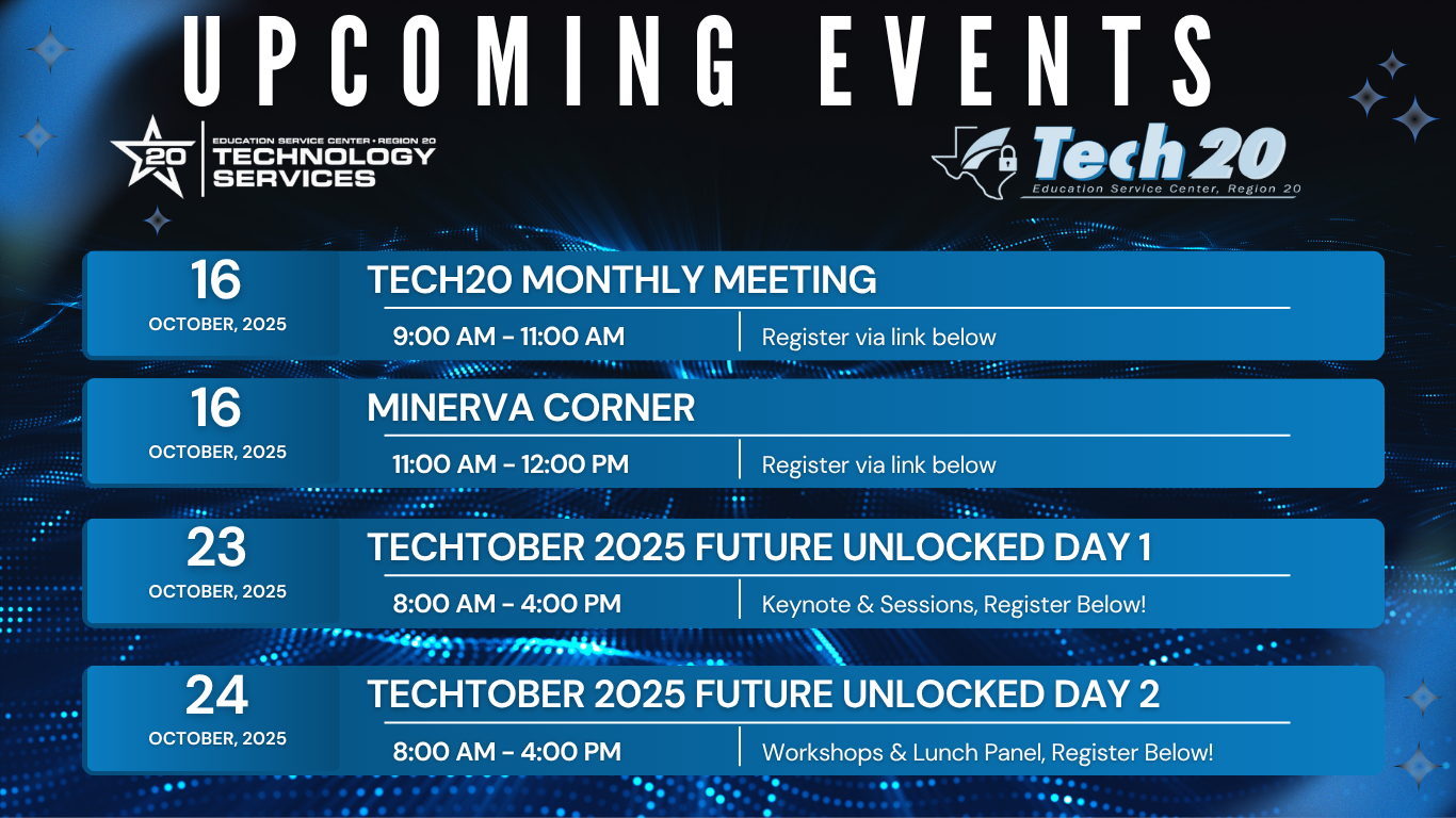 ESC-20 offers a wide range of services to help educational entities easily manage, support and maneuver the information technology world. We have the tools and expertise to provide top quality support at cost effective pricing. Our Technology Services include distance learning through videoconferencing for dual credit courses, access to the Texas Educational Telecommunications Network (TETN), live virtual programming as well as online technical training platforms. Also available is internet access as an e-rate provider along with cloud services, technical assistance and network services.